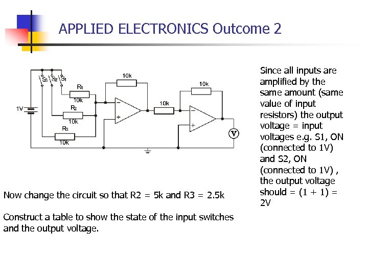 APPLIED ELECTRONICS Outcome 2 Now change the circuit so that R 2 = 5 k and R 3 = 2. 5 k Construct a table to show the state of the input switches and the output voltage. Since all inputs are amplified by the same amount (same value of input resistors) the output voltage = input voltages e. g. S 1, ON (connected to 1 V) and S 2, ON (connected to 1 V) , the output voltage should = (1 + 1) = 2 V
