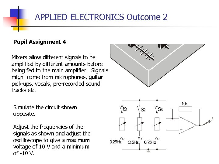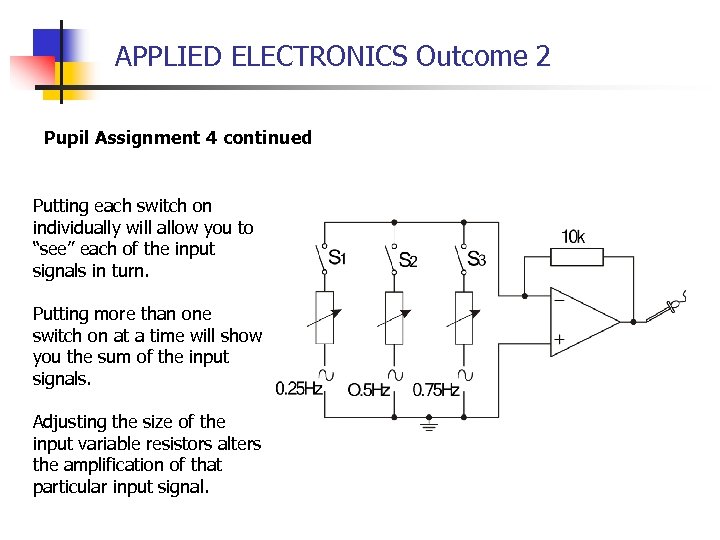 APPLIED ELECTRONICS Outcome 2 Pupil Assignment 4 continued Putting each switch on individually will allow you to “see” each of the input signals in turn. Putting more than one switch on at a time will show you the sum of the input signals. Adjusting the size of the input variable resistors alters the amplification of that particular input signal.