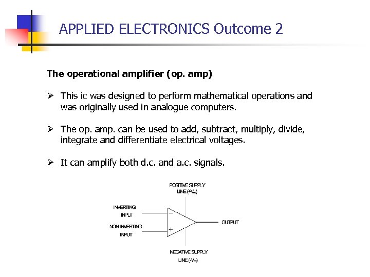 APPLIED ELECTRONICS Outcome 2 The operational amplifier (op. amp) Ø This ic was designed to perform mathematical operations and was originally used in analogue computers. Ø The op. amp. can be used to add, subtract, multiply, divide, integrate and differentiate electrical voltages. Ø It can amplify both d. c. and a. c. signals.