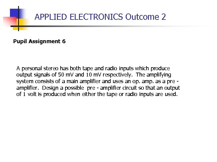 APPLIED ELECTRONICS Outcome 2 Pupil Assignment 6 A personal stereo has both tape and radio inputs which produce output signals of 50 m. V and 10 m. V respectively. The amplifying system consists of a main amplifier and uses an op. amp. as a pre amplifier. Design a possible pre - amplifier circuit so that an output of 1 volt is produced when either the tape or radio inputs are used.