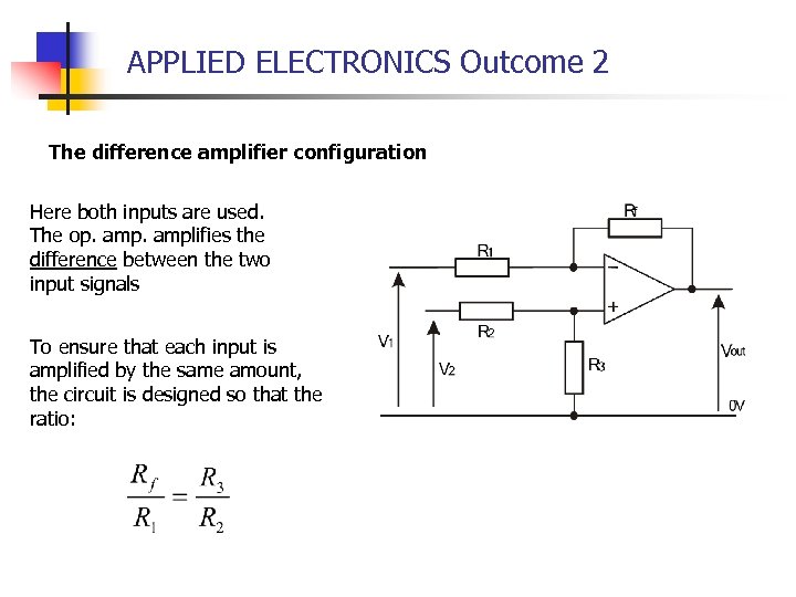 APPLIED ELECTRONICS Outcome 2 The difference amplifier configuration Here both inputs are used. The op. amplifies the difference between the two input signals To ensure that each input is amplified by the same amount, the circuit is designed so that the ratio: