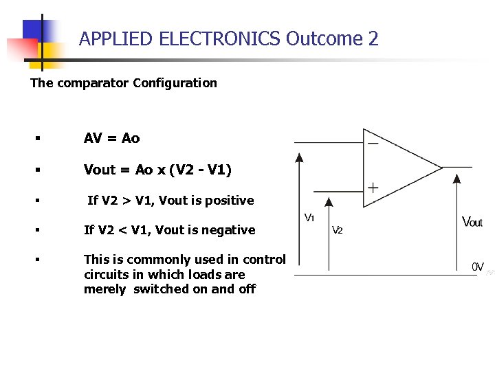 APPLIED ELECTRONICS Outcome 2 The comparator Configuration § AV = Ao § Vout = Ao x (V 2 - V 1) § If V 2 > V 1, Vout is positive § If V 2 < V 1, Vout is negative § This is commonly used in control circuits in which loads are merely switched on and off