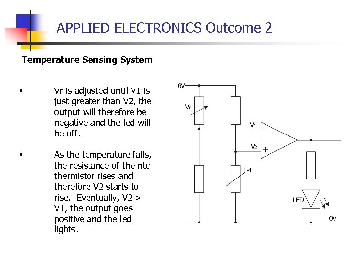APPLIED ELECTRONICS Outcome 2 Temperature Sensing System § Vr is adjusted until V 1 is just greater than V 2, the output will therefore be negative and the led will be off. § As the temperature falls, the resistance of the ntc thermistor rises and therefore V 2 starts to rise. Eventually, V 2 > V 1, the output goes positive and the led lights.