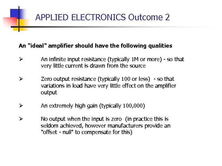APPLIED ELECTRONICS Outcome 2 An "ideal" amplifier should have the following qualities Ø An infinite input resistance (typically 1 M or more) - so that very little current is drawn from the source Ø Zero output resistance (typically 100 or less) - so that variations in load have very little effect on the amplifier output Ø An extremely high gain (typically 100, 000) Ø No output when the input is zero (in practice this is seldom achieved, however manufacturers provide an "offset - null" to compensate for this)