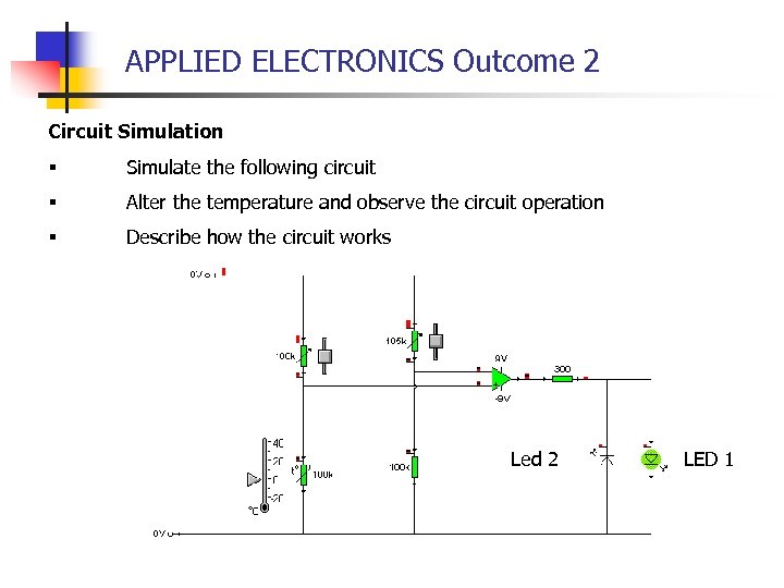 APPLIED ELECTRONICS Outcome 2 Circuit Simulation § Simulate the following circuit § Alter the temperature and observe the circuit operation § Describe how the circuit works Led 2 LED 1