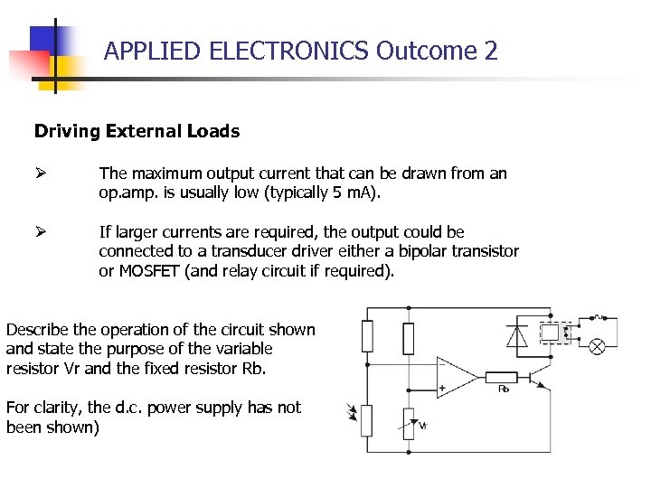 APPLIED ELECTRONICS Outcome 2 Driving External Loads Ø The maximum output current that can be drawn from an op. amp. is usually low (typically 5 m. A). Ø If larger currents are required, the output could be connected to a transducer driver either a bipolar transistor or MOSFET (and relay circuit if required). Describe the operation of the circuit shown and state the purpose of the variable resistor Vr and the fixed resistor Rb. For clarity, the d. c. power supply has not been shown)