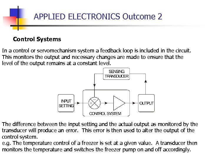 APPLIED ELECTRONICS Outcome 2 Control Systems In a control or servomechanism system a feedback loop is included in the circuit. This monitors the output and necessary changes are made to ensure that the level of the output remains at a constant level. The difference between the input setting and the actual output as monitored by the transducer will produce an error. This error is then used to alter the output of the control system. e. g. The temperature control of a freezer is set at a given value. A transducer then monitors the temperature and switches the freezer pump on and off accordingly.
