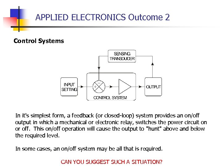 APPLIED ELECTRONICS Outcome 2 Control Systems In it's simplest form, a feedback (or closed-loop) system provides an on/off output in which a mechanical or electronic relay, switches the power circuit on or off. This on/off operation will cause the output to "hunt" above and below the required level. In some cases, an on/off system may be all that is required. CAN YOU SUGGEST SUCH A SITUATION?