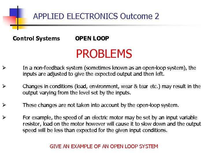 APPLIED ELECTRONICS Outcome 2 Control Systems OPEN LOOP PROBLEMS Ø In a non-feedback system (sometimes known as an open-loop system), the inputs are adjusted to give the expected output and then left. Ø Changes in conditions (load, environment, wear & tear etc. ) may result in the output varying from the level set by the inputs. Ø These changes are not taken into account by the open-loop system. Ø For example, the speed of an electric motor may be set by an input variable resistor, load on the motor however will cause it to slow down and the output speed will be less than expected for the given input conditions. GIVE AN EXAMPLE OF AN OPEN LOOP SYSTEM