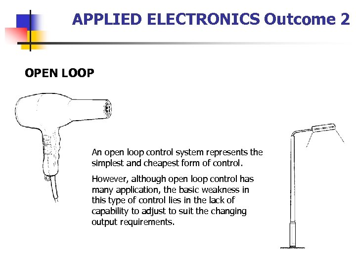 APPLIED ELECTRONICS Outcome 2 OPEN LOOP An open loop control system represents the simplest and cheapest form of control. However, although open loop control has many application, the basic weakness in this type of control lies in the lack of capability to adjust to suit the changing output requirements.