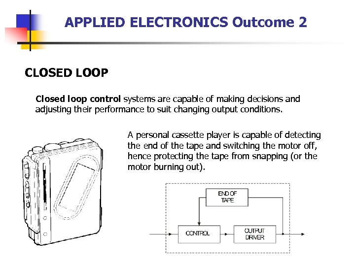 APPLIED ELECTRONICS Outcome 2 CLOSED LOOP Closed loop control systems are capable of making decisions and adjusting their performance to suit changing output conditions. A personal cassette player is capable of detecting the end of the tape and switching the motor off, hence protecting the tape from snapping (or the motor burning out).