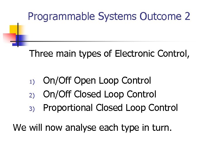 Programmable Systems Outcome 2 Three main types of Electronic Control, 1) 2) 3) On/Off Open Loop Control On/Off Closed Loop Control Proportional Closed Loop Control We will now analyse each type in turn.