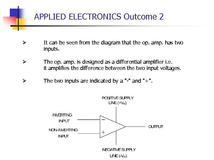 APPLIED ELECTRONICS Outcome 2 Ø It can be seen from the diagram that the op. amp. has two inputs. Ø The op. amp. is designed as a differential amplifier i. e. it amplifies the difference between the two input voltages. Ø The two inputs are indicated by a "-" and "+".