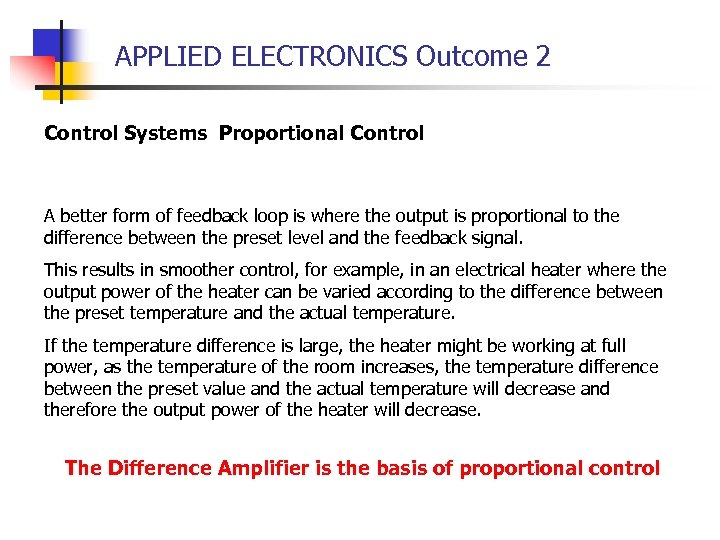 APPLIED ELECTRONICS Outcome 2 Control Systems Proportional Control A better form of feedback loop is where the output is proportional to the difference between the preset level and the feedback signal. This results in smoother control, for example, in an electrical heater where the output power of the heater can be varied according to the difference between the preset temperature and the actual temperature. If the temperature difference is large, the heater might be working at full power, as the temperature of the room increases, the temperature difference between the preset value and the actual temperature will decrease and therefore the output power of the heater will decrease. The Difference Amplifier is the basis of proportional control