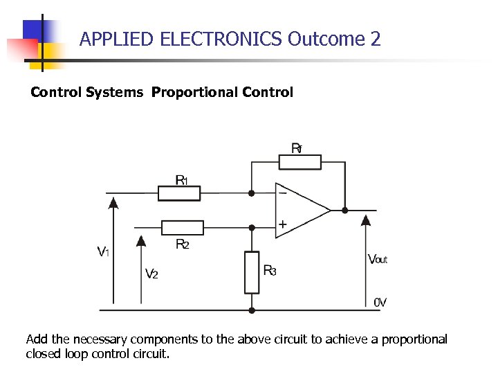 APPLIED ELECTRONICS Outcome 2 Control Systems Proportional Control Add the necessary components to the above circuit to achieve a proportional closed loop control circuit.