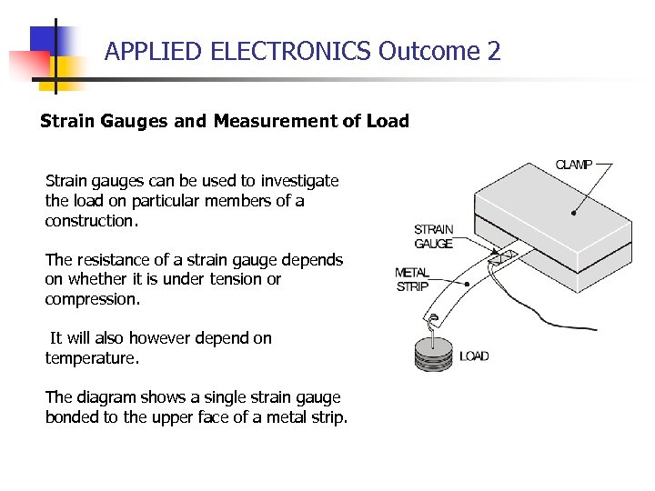 APPLIED ELECTRONICS Outcome 2 Strain Gauges and Measurement of Load Strain gauges can be used to investigate the load on particular members of a construction. The resistance of a strain gauge depends on whether it is under tension or compression. It will also however depend on temperature. The diagram shows a single strain gauge bonded to the upper face of a metal strip.