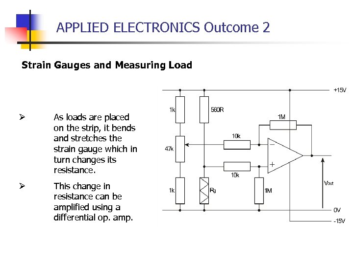 APPLIED ELECTRONICS Outcome 2 Strain Gauges and Measuring Load Ø As loads are placed on the strip, it bends and stretches the strain gauge which in turn changes its resistance. Ø This change in resistance can be amplified using a differential op. amp.