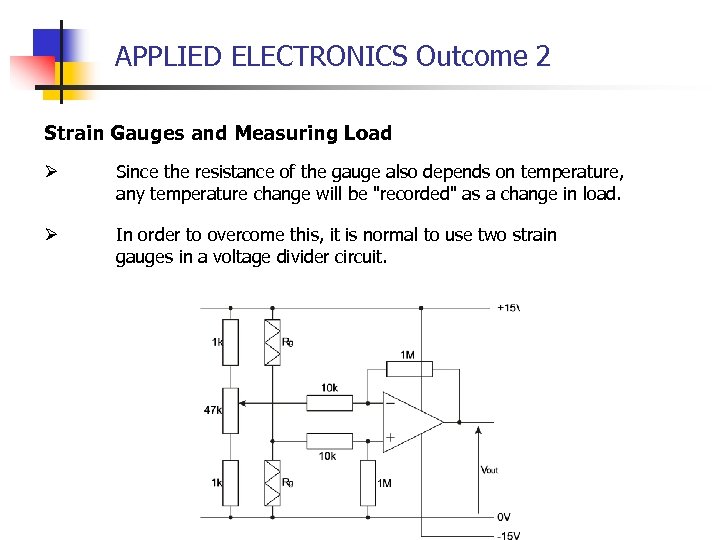APPLIED ELECTRONICS Outcome 2 Strain Gauges and Measuring Load Ø Since the resistance of the gauge also depends on temperature, any temperature change will be "recorded" as a change in load. Ø In order to overcome this, it is normal to use two strain gauges in a voltage divider circuit.