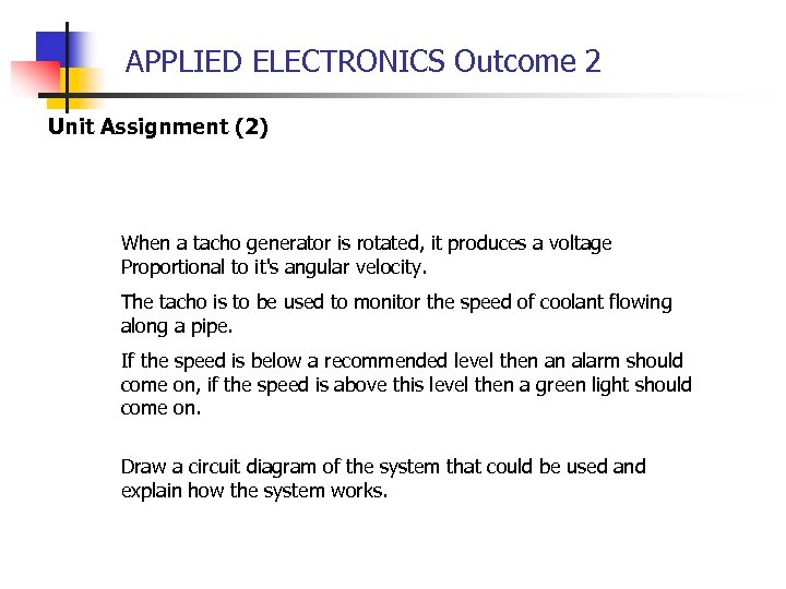 APPLIED ELECTRONICS Outcome 2 Unit Assignment (2) When a tacho generator is rotated, it produces a voltage Proportional to it's angular velocity. The tacho is to be used to monitor the speed of coolant flowing along a pipe. If the speed is below a recommended level then an alarm should come on, if the speed is above this level then a green light should come on. Draw a circuit diagram of the system that could be used and explain how the system works.