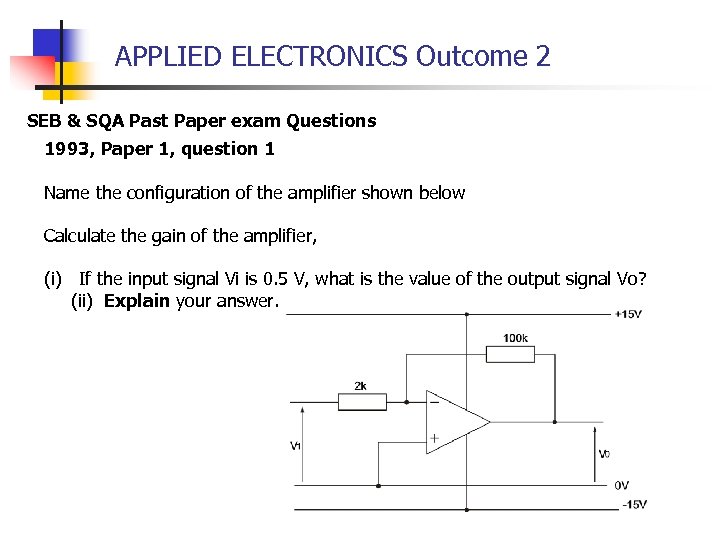 APPLIED ELECTRONICS Outcome 2 SEB & SQA Past Paper exam Questions 1993, Paper 1, question 1 Name the configuration of the amplifier shown below Calculate the gain of the amplifier, (i) If the input signal Vi is 0. 5 V, what is the value of the output signal Vo? (ii) Explain your answer.