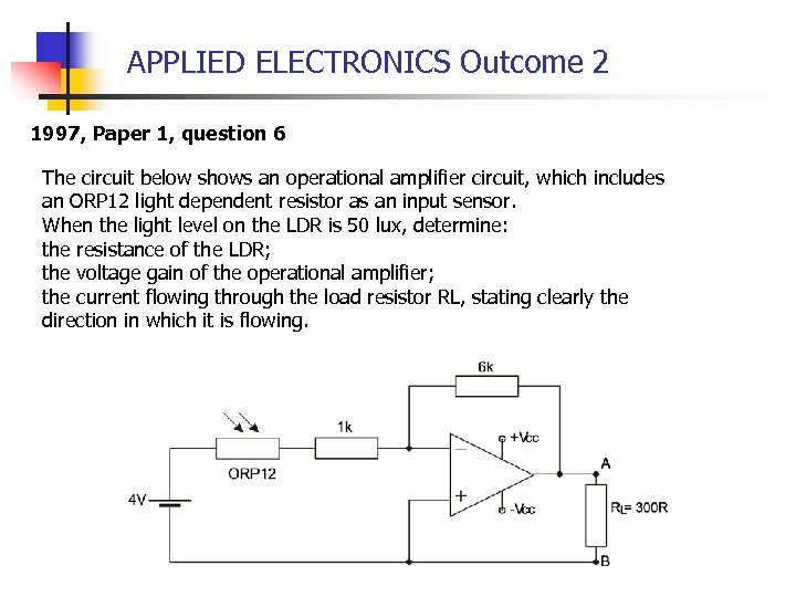 APPLIED ELECTRONICS Outcome 2 1997, Paper 1, question 6 The circuit below shows an operational amplifier circuit, which includes an ORP 12 light dependent resistor as an input sensor. When the light level on the LDR is 50 lux, determine: the resistance of the LDR; the voltage gain of the operational amplifier; the current flowing through the load resistor RL, stating clearly the direction in which it is flowing.