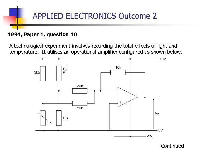 APPLIED ELECTRONICS Outcome 2 1994, Paper 1, question 10 Name the configuration of the amplifier used in the experiment. Explain clearly how the system operates. Determine the gain of the amplifier. Comment on the suitability of the value of the gain in this particular circuit. Continued