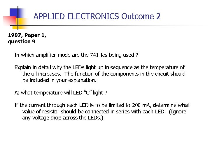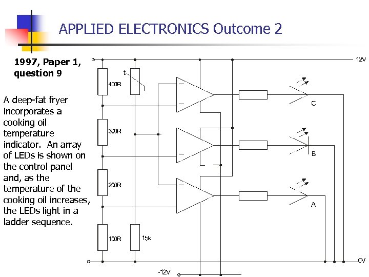 APPLIED ELECTRONICS Outcome 2 1997, Paper 1, question 9 In which amplifier mode are the 741 Ics being used ? Explain in detail why the LEDs light up in sequence as the temperature of the oil increases. The function of the components in the circuit should be included in your explanation. At what temperature will LED “C” light ? If the current through each LED is to be limited to 200 m. A, determine what value of resistor should be connected in series with each LED. (Ignore any voltage drop across the LEDs. )
