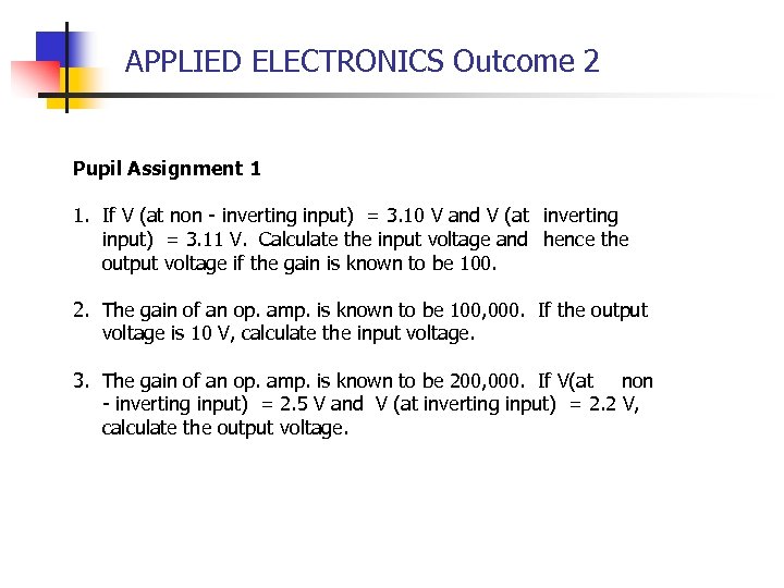 APPLIED ELECTRONICS Outcome 2 Pupil Assignment 1 1. If V (at non - inverting input) = 3. 10 V and V (at inverting input) = 3. 11 V. Calculate the input voltage and hence the output voltage if the gain is known to be 100. 2. The gain of an op. amp. is known to be 100, 000. If the output voltage is 10 V, calculate the input voltage. 3. The gain of an op. amp. is known to be 200, 000. If V(at non - inverting input) = 2. 5 V and V (at inverting input) = 2. 2 V, calculate the output voltage.