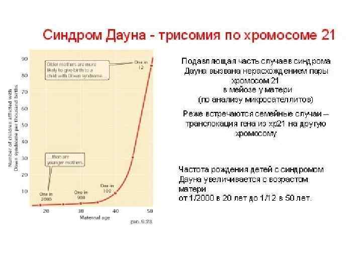 Таблица. Риск хромосомных аномалий, выявляемых во II триместре беременности Возраст беременной, годы Риск синдрома Дауна Общий риск хромосомных аномалий 29 1: 850 1: 750 30 1: 720 1: 540 31 1: 620 1: 370 32 1: 520 1: 280 33 1: 420 1: 220 34 1: 320 1: 170 35 1: 250 1: 140 36 1: 190 1: 100 37 1: 150 1: 80 38 1: 110 1: 60 39 1: 90 1: 50 40 1: 70 1: 40 41 1: 50 1: 30 42 1: 40 1: 25 43 1: 30 1: 20 44 1: 25 1: 15 45 1: 20 1: 12 46 1: 15 1: 9 47 1: 12 1: 7 48 1: 9 1: 6 49 1: 7 1: 4