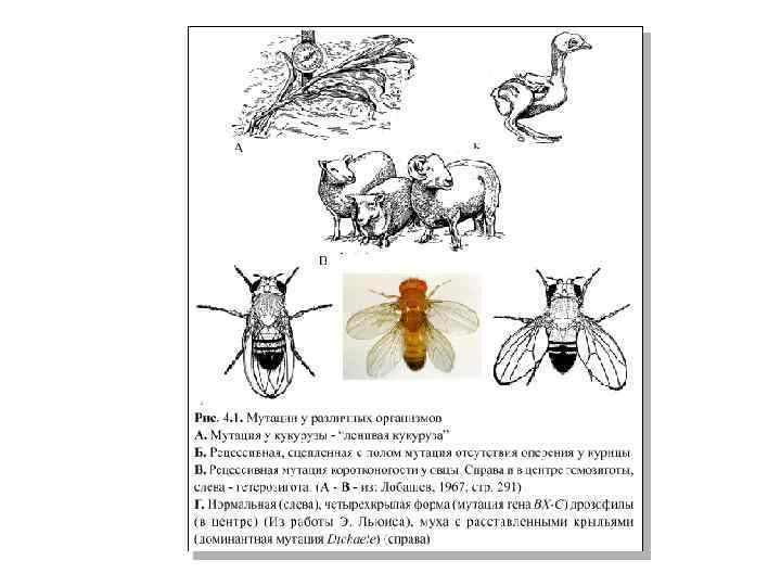 Мутации окраски и формы глаз у плодовой мушки — дрозофилы: 1 — дикий тип — тускло-красные глаза; мутантные формы: 2 — розовые глаза, 3 — белые глаза, 4 — уменьшенные, «плосковидные» .