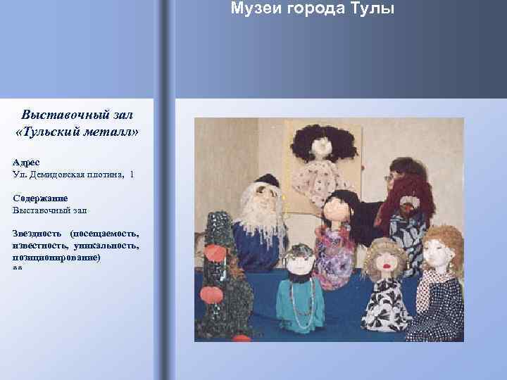 Музеи города Тулы Выставочный зал «Тульский металл» Адрес Ул. Демидовская плотина, 1 Содержание Выставочный зал Звездность (посещаемость, известность, уникальность, позиционирование) **
