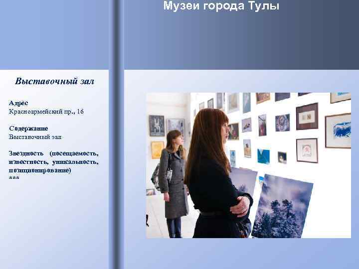 Музеи города Тулы Выставочный зал Адрес Красноармейский пр. , 16 Содержание Выставочный зал Звездность (посещаемость, известность, уникальность, позиционирование) ***