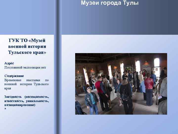 Музеи города Тулы ГУК ТО «Музей военной истории Тульского края» Адрес Постоянной экспозиции нет Содержание Временные выставки по военной истории Тульского края Звездность (посещаемость, известность, уникальность, позиционирование) *
