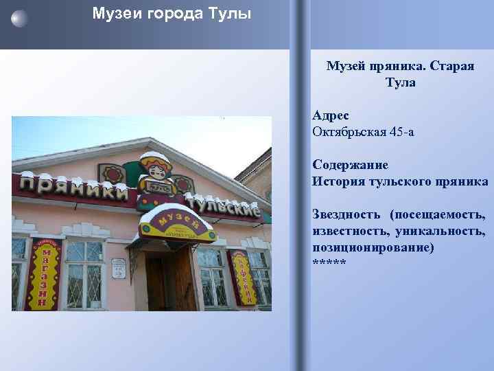 Музеи города Тулы Музей пряника. Старая Тула Адрес Октябрьская 45 -а Содержание История тульского пряника Звездность (посещаемость, известность, уникальность, позиционирование) *****