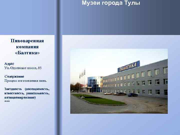 Музеи города Тулы Пивоваренная компания «Балтика» Адрес Ул. Одоевское шоссе, 85 Содержание Процесс изготовления пива. Звездность (посещаемость, известность, уникальность, позиционирование) ***