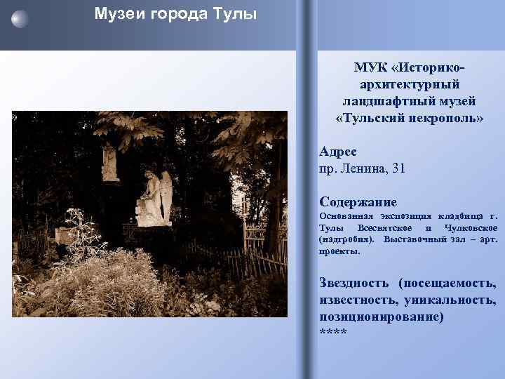 Музеи города Тулы МУК «Историкоархитектурный ландшафтный музей «Тульский некрополь» Адрес пр. Ленина, 31 Содержание Основанная экспозиция кладбища г. Тулы Всесвятское и Чулковское (надгробия). Выставочный зал – арт. проекты. Звездность (посещаемость, известность, уникальность, позиционирование) ****