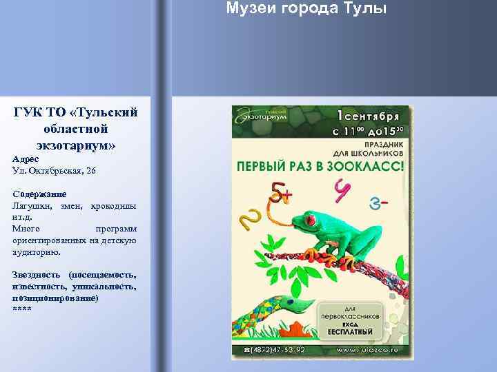 Музеи города Тулы ГУК ТО «Тульский областной экзотариум» Адрес Ул. Октябрьская, 26 Содержание Лягушки, змеи, крокодилы ит. д. Много программ ориентированных на детскую аудиторию. Звездность (посещаемость, известность, уникальность, позиционирование) ****
