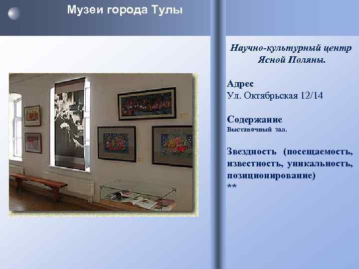 Музеи города Тулы Научно-культурный центр Ясной Поляны. Адрес Ул. Октябрьская 12/14 Содержание Выставочный зал. Звездность (посещаемость, известность, уникальность, позиционирование) **