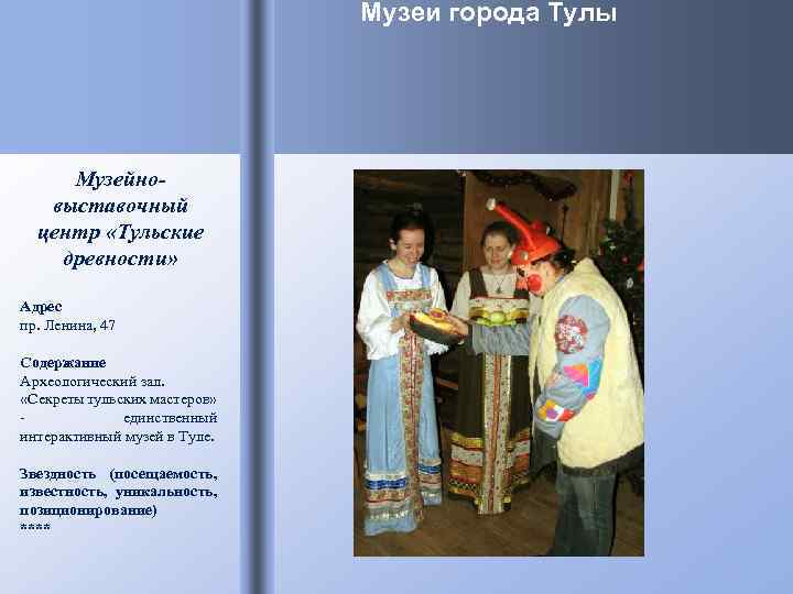 Музеи города Тулы Музейновыставочный центр «Тульские древности» Адрес пр. Ленина, 47 Содержание Археологический зал. «Секреты тульских мастеров» единственный интерактивный музей в Туле. Звездность (посещаемость, известность, уникальность, позиционирование) ****