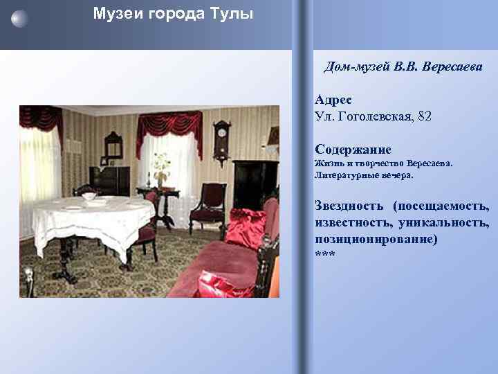 Музеи города Тулы Дом-музей В. В. Вересаева Адрес Ул. Гоголевская, 82 Содержание Жизнь и творчество Вересаева. Литературные вечера. Звездность (посещаемость, известность, уникальность, позиционирование) ***