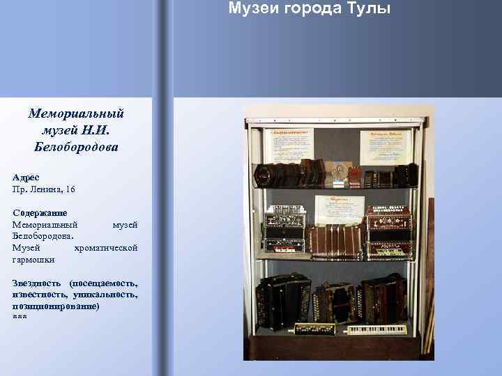 Музеи города Тулы Мемориальный музей Н. И. Белобородова Адрес Пр. Ленина, 16 Содержание Мемориальный музей Белобородова. Музей хроматической гармошки Звездность (посещаемость, известность, уникальность, позиционирование) ***