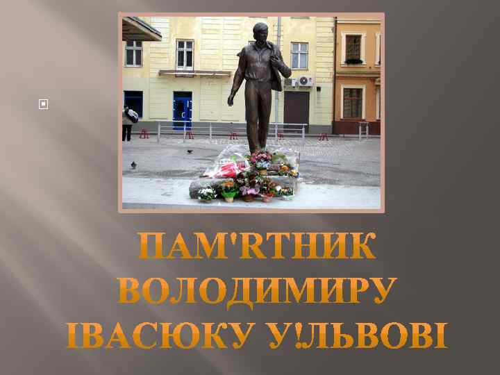 Відкриття пам’ятника Володимиру Івасюку Пам’ятник Володимиру Івасюку У вівторок, 20 грудня 2011 року пройшла церемонія відкриття пам'ятника. Участь у церемонії відкриття монументу, зокрема, взяли ініціатор зведення пам'ятника, музикант Святослав та родичі Івасюка.