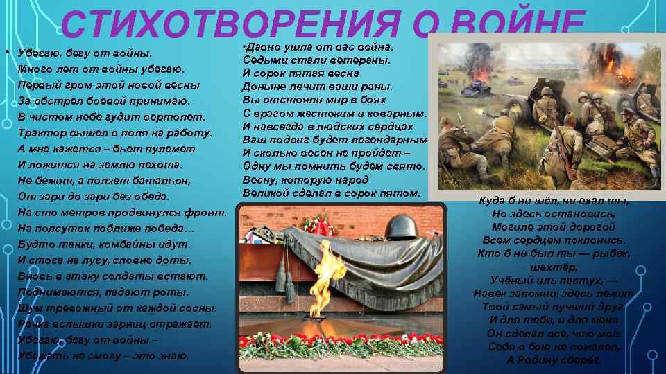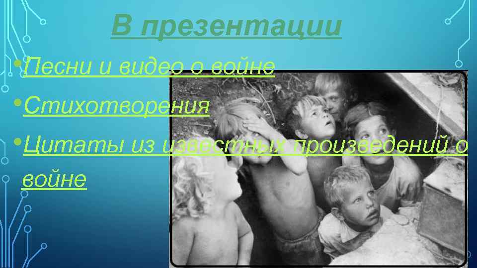 В презентации • Песни и видео о войне • Стихотворения • Цитаты из известных произведений о войне