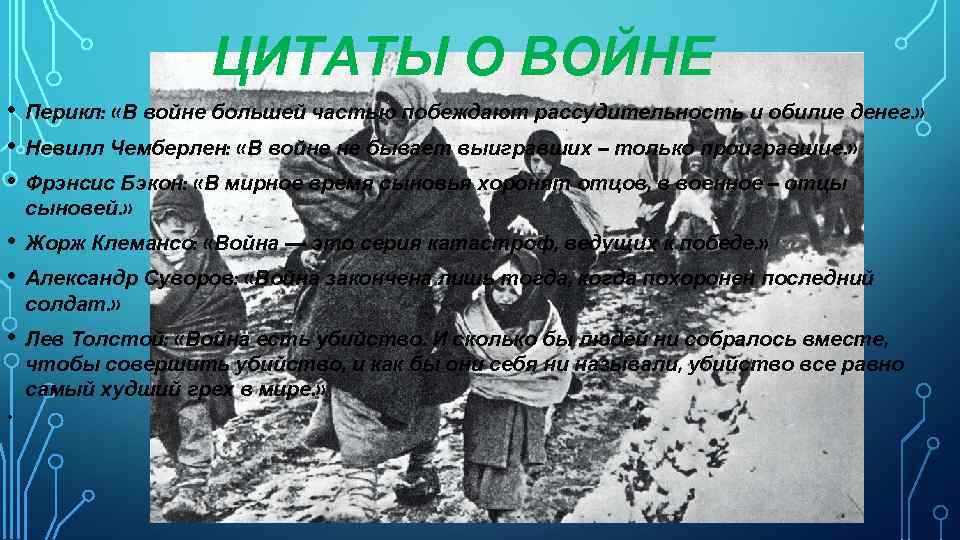 ЦИТАТЫ О ВОЙНЕ • • • Перикл: «В войне большей частью побеждают рассудительность и обилие денег. » • • Жорж Клемансо: «Война — это серия катастроф, ведущих к победе. » • Лев Толстой: «Война есть убийство. И сколько бы людей ни собралось вместе, чтобы совершить убийство, и как бы они себя ни называли, убийство все равно самый худший грех в мире. » • Невилл Чемберлен: «В войне не бывает выигравших – только проигравшие. » Фрэнсис Бэкон: «В мирное время сыновья хоронят отцов, в военное – отцы сыновей. » Александр Суворов: «Война закончена лишь тогда, когда похоронен последний солдат. »