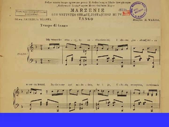 5. Piosenka + Tango (1 = 1, 5%) W modnym barze "Continental" = (Cafe Continental) : tango-foxtrot / muzyka Will Grosz ; słowa polskie Jack ; słowa ang. Jimmy Kennedy. Warszawa : "Fermata", cop. 1938. Na fort. z tekstem podłoż. Piosenka austriacka - 20 w. Tango (fortepian) - 20 w. (3 = 4, 5%) Chcę właśnie ciebie. . . : tango / muz. S. Kataszka ; sł. St. Felixa. Warszawa : I. Rzepecki, [ca 1930]. Na fort. z tekstem podłoż. Muzyka polska - 20 w. Piosenka polska - 20 w. Tango (fortepian) - 20 w. (1 = 1, 5%) Zatańczmy tango / muzyka H. Warsa ; sł. A. Własta. Warszawa : I. Rzepecki, [1930]. Na fort. z tekstem podłoż. Muzyka polska - 20 w. Piosenka polska - 20 w. Tango (głos i fortepian) - 20 w.