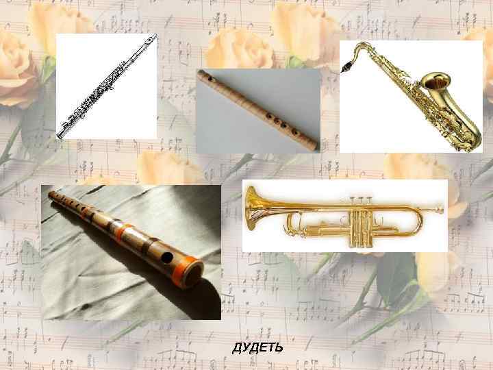 Духовые • Медные (труба, корнет, тромбон, валторна, туба, геликон) • Язычковые (губная гармоника, аккордеон, баян, гармонь) • Деревянные (дудка, флейта, кларнет, гобой, фагот)
