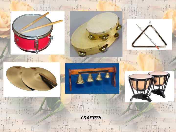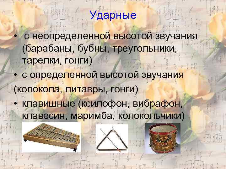 Ударные • с неопределенной высотой звучания (барабаны, бубны, треугольники, тарелки, гонги) • с определенной высотой звучания (колокола, литавры, гонги) • клавишные (ксилофон, вибрафон, клавесин, маримба, колокольчики)