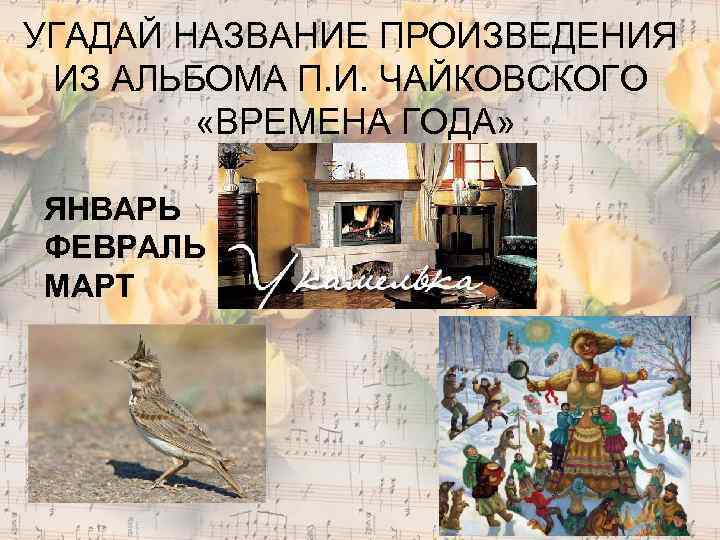 УГАДАЙ НАЗВАНИЕ ПРОИЗВЕДЕНИЯ ИЗ АЛЬБОМА П. И. ЧАЙКОВСКОГО «ВРЕМЕНА ГОДА» ЯНВАРЬ ФЕВРАЛЬ МАРТ