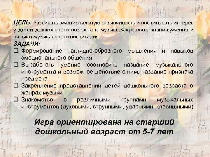 ЦЕЛЬ: Развивать эмоциональную отзывчивость и воспитывать интерес у детей дошкольного возраста к музыке. Закреплять знания, умения и навыки музыкального воспитания. ЗАДАЧИ: q Формирование наглядно-образного мышления и навыков эмоционального общения q Выработать умение соотносить название музыкального инструмента и возможное действие с ним, название признака предмета q Закрепление представлений детей дошкольного возраста о жанрах музыки q Знакомство с различными группами музыкальных инструментов (духовыми, струнными, ударными, клавишными) Игра ориентирована на старший дошкольный возраст от 5 -7 лет