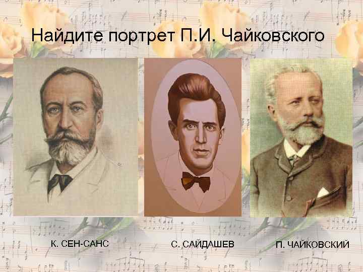 Найдите портрет П. И. Чайковского К. СЕН-САНС С. САЙДАШЕВ П. ЧАЙКОВСКИЙ